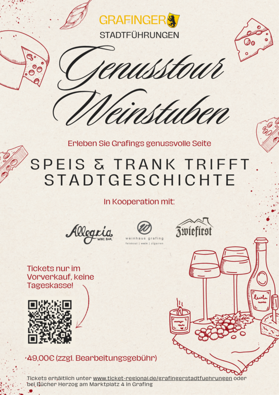 - Treffpunkt: Am Weinhaus Grafing, Marktplatz 20 (Teilnahme nur mit bereits im Vorverkauf erworbenem Ticket möglich!)