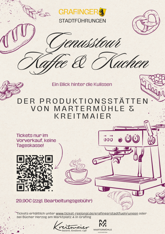 - Thema 2: „Grafinger Genusstour – Kaffee & Kuchen“ in Kooperation mit der Kaffeerösterei Martermühle und der Bäckerei Kreitmaier