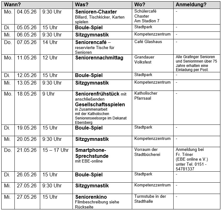 Wer Interesse hat, meldet sich bitte bis Montag, den 20.04.2026 bei der Seniorenberatungsstelle an, zu den Sprechzeiten unter Tel. 08092 – 703 1415 oder per E-Mail unter beratungsstelle@grafing.de. Die Kosten betragen pro Teilnehmer 15€.