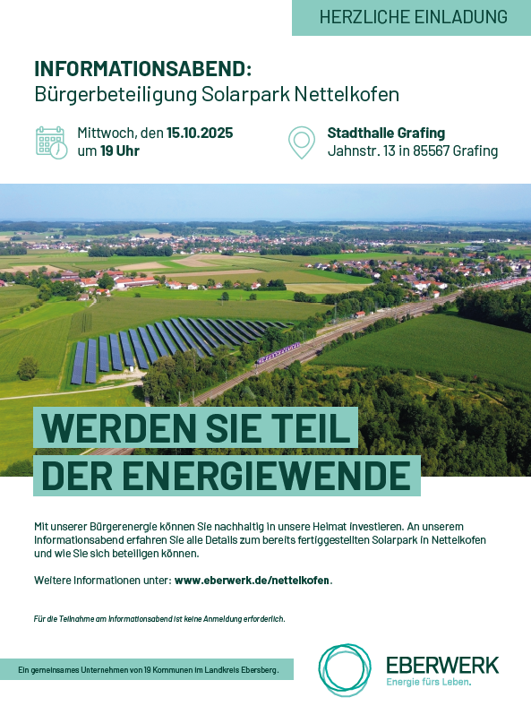 Am 15. Oktober 2025 um 19 Uhr in der Stadthalle Grafing. Eine Anmeldung ist nicht erforderlich. Im März dieses Jahres startete der regionale Energieversorger EBERwerk mit den Bauarbeiten für einen neuen Solarpark bei Nettelkofen. Nun sind die Bauarbeiten weitgehend abgeschlossen und nach erfolgter Zertifizierung kann die Anlage zeitnah in Betrieb genommen werden. Der nördlich von der Bahnlinie gelegene Solarpark, hat eine Gesamtleistung von ca. 4,2 Megawatt-Peak (MWp) und wird pro Jahr rund 4,4 Megawattstunden (MWh) sauberen Ökostrom erzeugen. Mit dieser Strommenge können ca. 1.300 Haushalte versorgt werden und jährlich 1.900 t an CO2 eingespart werden. Die Stadt Grafing kann durch dieses Projekt ihren Anteil der erneuerbaren Energien am jährlichen Strombedarf im Stadtgebiet deutlich steigern – von 37 auf 47 %. Ein riesiger Schritt also für die Stadt Grafing und den Landkreis Ebersberg auf dem Weg zur Klimaneutralität. Von dem Projekt sollen zukünftig auch alle interessierten Bürger, Unternehmen und Kommunen des Landkreis Ebersberg profitieren, denn das EBERwerk bietet eine umfassende Beteiligung am Solarpark Nettelkofen an.