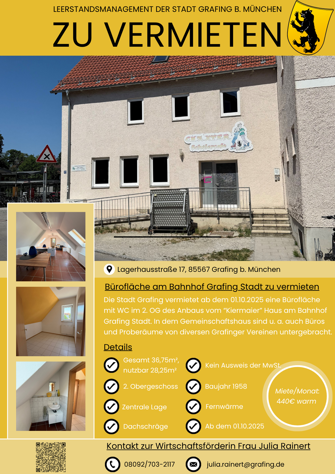 Bei Interesse an einer Anmietung kontaktieren Sie bitte direkt die Liegenschaftsverwaltung der Stadt Grafing via:
